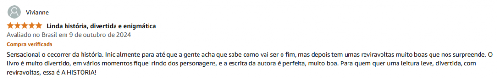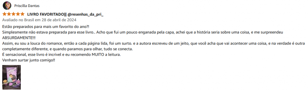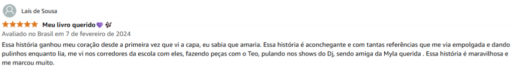 "devorei o livro em 3 dias!!! Eu amei a história e o desenrolar dela. tinha quase certeza que o DJ era... Mas fiquei de queixo caído quando descobri... Parabéns por mais um livro incrível! Fácil de ler e envolvente".